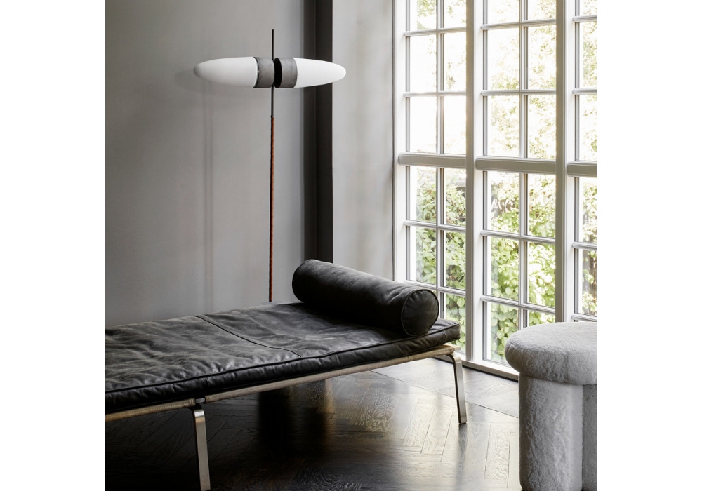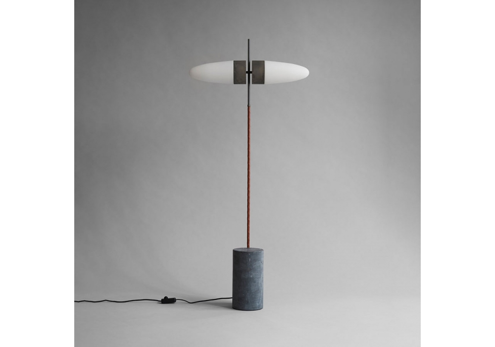 Bull conçu par Kristian Sofus Hansen & Tommy Hyldahl pour 101 Copenhagen est un lampadaire avec base en marbre gris non poli, bras en aluminium oxydé recouvert de cuir couleur cognac et partie supérieure en aluminium oxydé. Abat-jour en verre transparent translucide.