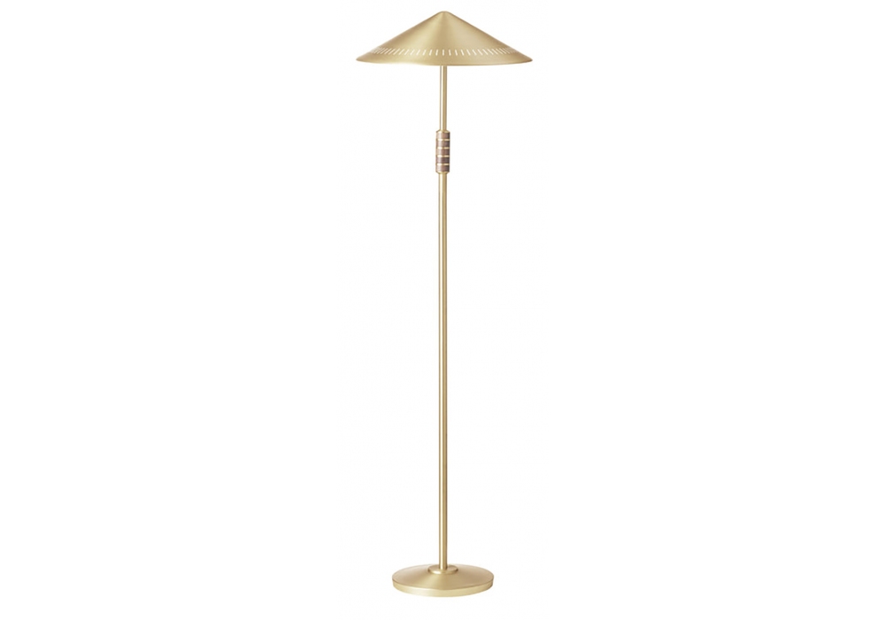 Governor conçue par Bent Karlby pour Lyfa est une lampadaire, l'abat-jour, la tige et la base sont tous en laiton mat, la poignée décorative est en noyer avec des incrustations en laiton.