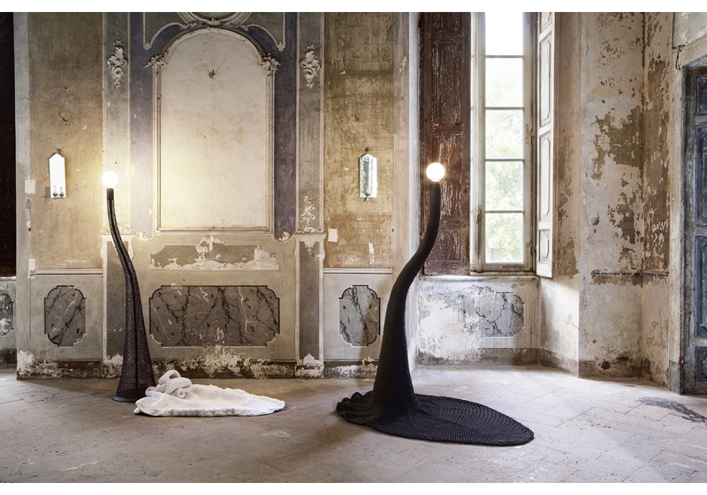 Penelope conçu par Domenico Rinaldi pour Fisionarte est un lampadaire avec structure portante en maille métallique tissée à la main peinte en noir. Rembourrage en tissu crocheté ignifuge. Penelope est disponible en différentes finitions et avec ou sans source lumineuse.