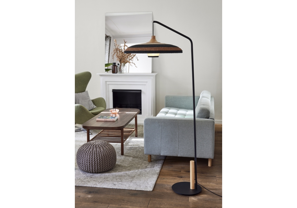 Grass conçu par Jette Scheib pour Forestier est un lampadaire avec diffuseur en bois recouvert d'un cordon textile en velours et coton et base en métal noir. Disponible en différentes finitions.
