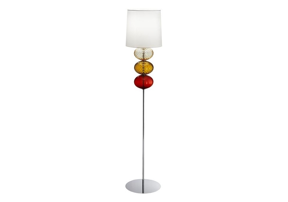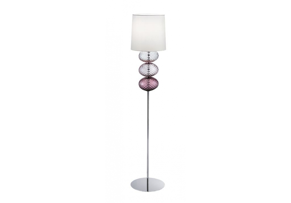 Abat-Jour conçu et produit par Venini est un lampadaire avec abat-jour en tissu blanc et structure en métal chromé, agrémenté de 3 perles de verre soufflé avec traitement balloton. Disponible en 2 combinaisons de couleurs.