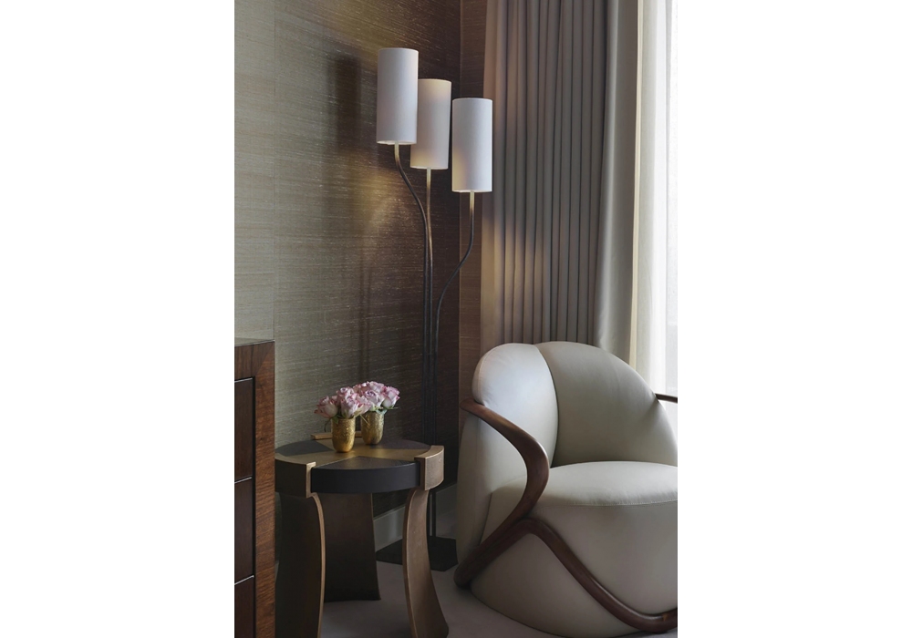 Hydra conçu et produit par Porta Romana est un lampadaire avec une base quadrangulaire structurée en laiton et acier peint. Les abat-jour sont cylindriques en tissu et masquent une source lumineuse avec une douille E14 de type LED. Hydra disponible en différentes finitions de structure et de tissu.