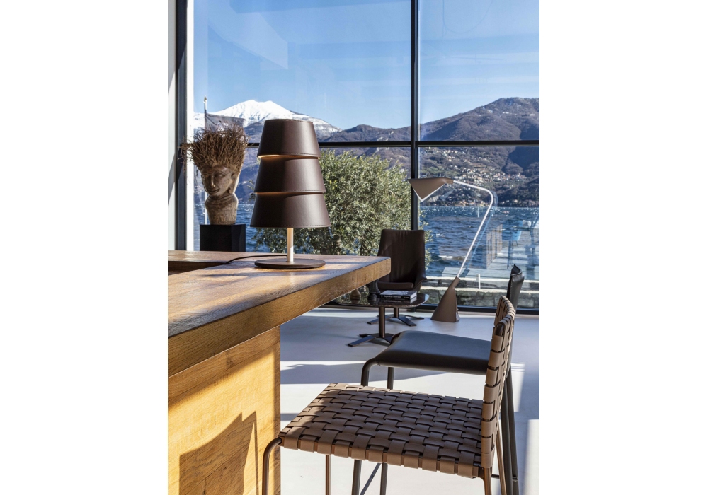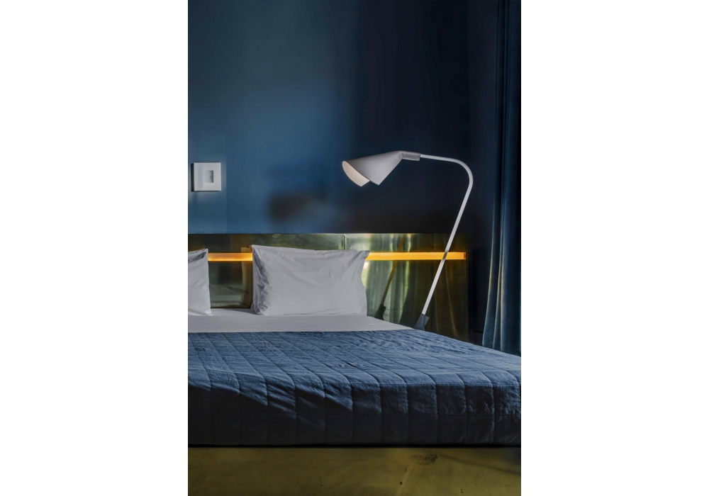 Duffy XL conçu par Stefano Santilio pour Enrico Pellizzoni est un lampadaire en laiton satiné ou peint en blanc, diffuseur recouvert de cuir, disponible en différentes couleurs.