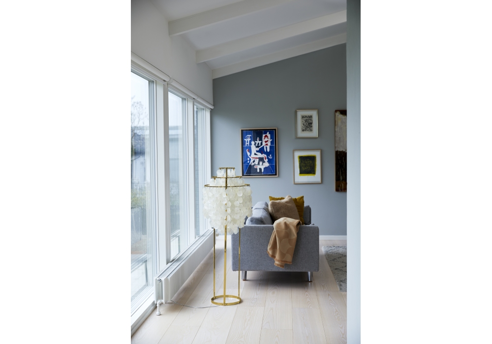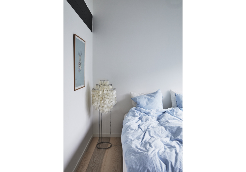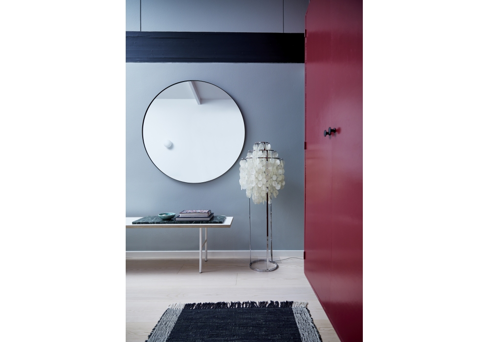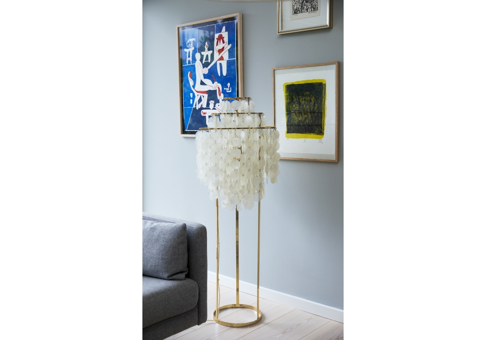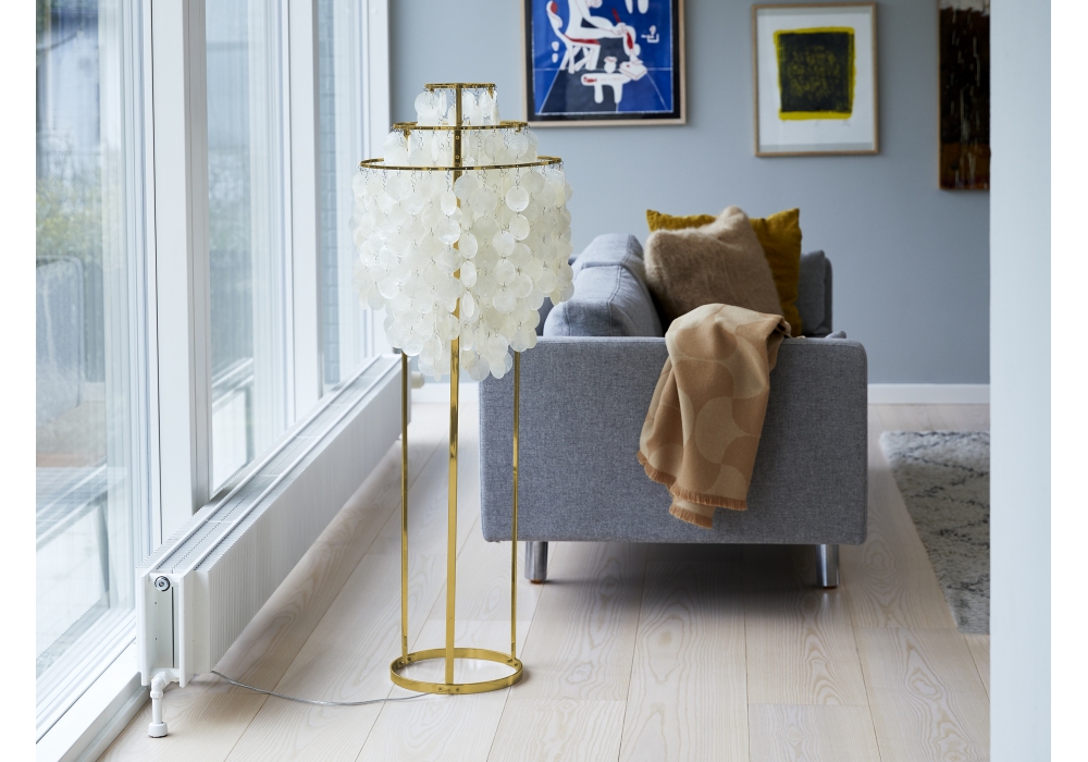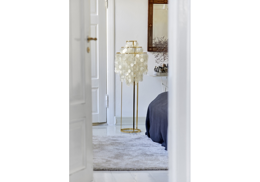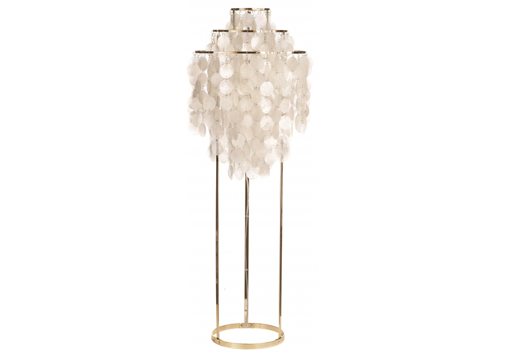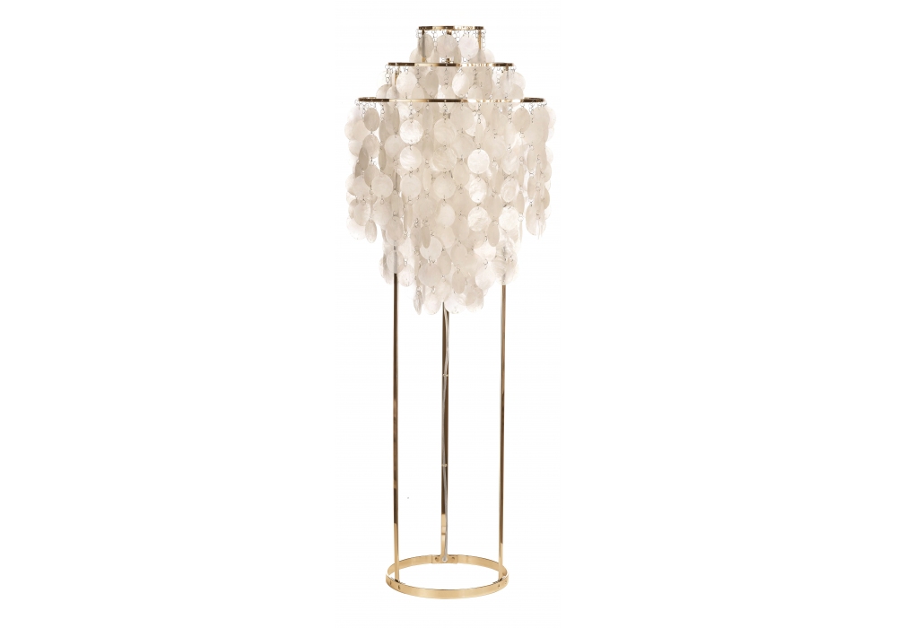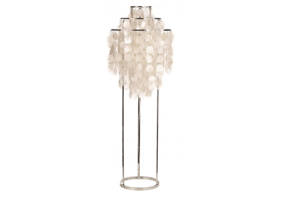 Fun conçu par Verner Panton pour Verpan est un lampadaire composé de disques de nacre sur une structure en métal. Les disques sont reliés les uns aux autres grâce à de petits anneaux métalliques. Structure en métal chromé ou bronze. Il y a un interrupteur marche/arrêt sur le cordon d'alimentation (transparent). Disponible en différentes finitions.