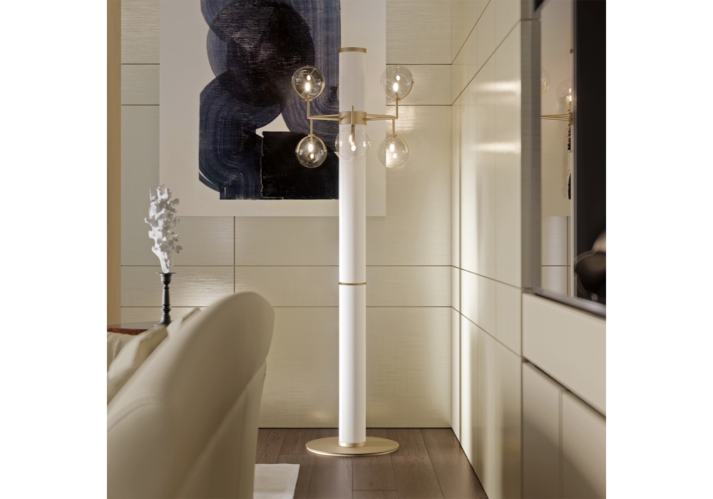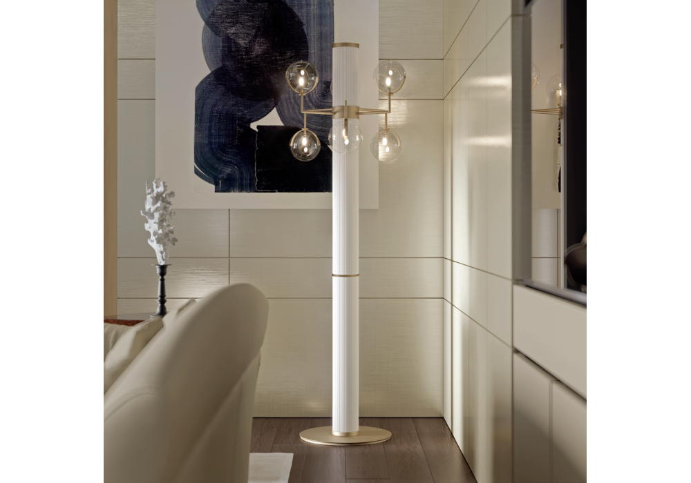 Madison conçu par Andrea Bonini pour Turri est un lampadaire avec une colonne centrale en métal rainuré qui supporte des bras en métal satiné sur lesquels sont appliquées des sphères lumineuses transparentes.