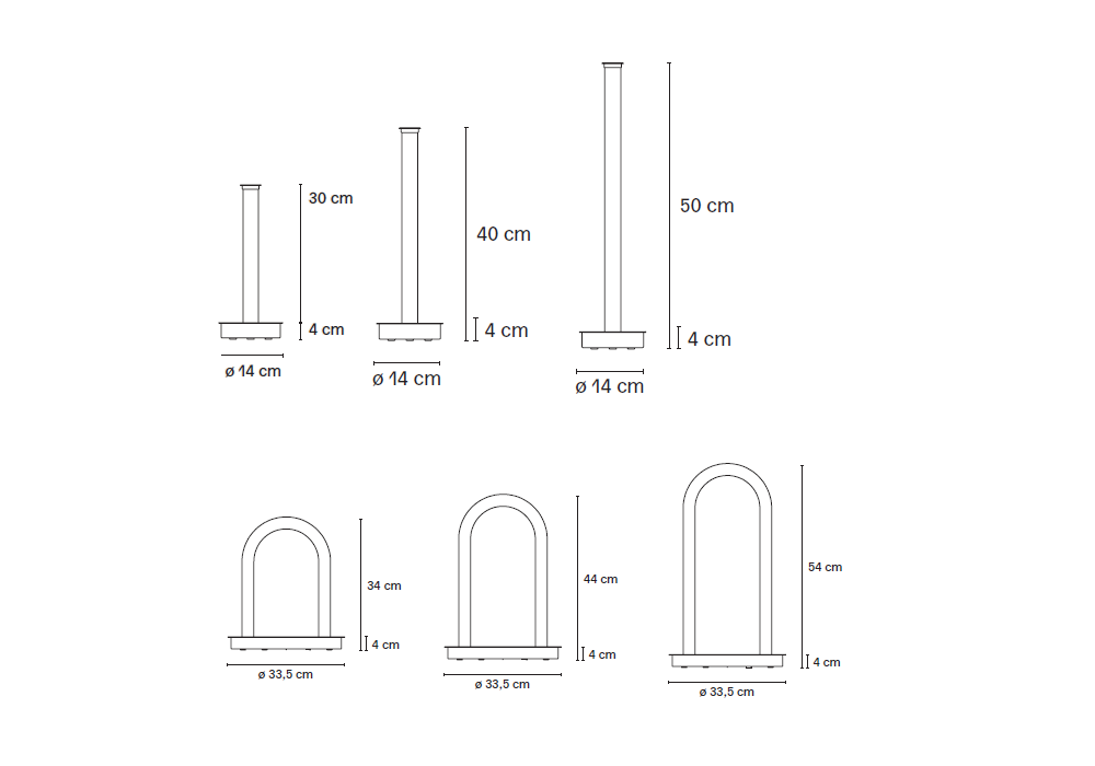 | Dimensions | Ø 14 x H 30 cm; Ø 14 x H 40 cm; Ø 14 x H 50 cm; Ø 33.5 x H 34 cm; Ø 33.5 x H 44 cm; Ø 33.5 x H 54 cm. |