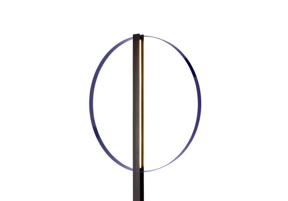 Lampada da Appartamento conçu par Panter & Tourron pour Cappellini est un lampadaire à lumière diffuse, composé d'un corps métallique vertical et de deux arcs métalliques peints en bleu métallique fixés autour de la source lumineuse qui créent un anneau lumineux parfait.