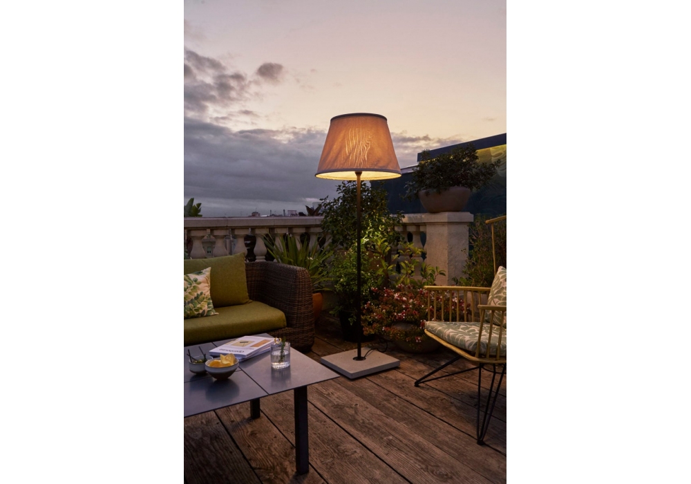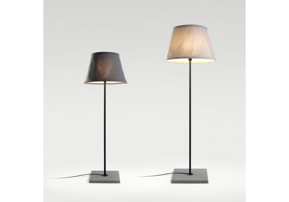 Txl 2019 conçu par Joan Gaspar pour Marset est un lampadaire avec base en béton, tige en acier inoxydable, diffuseur en verre blanc, abat-jour en tissu de différentes couleurs et intérieur en finition blanche. Disponible en deux tailles.