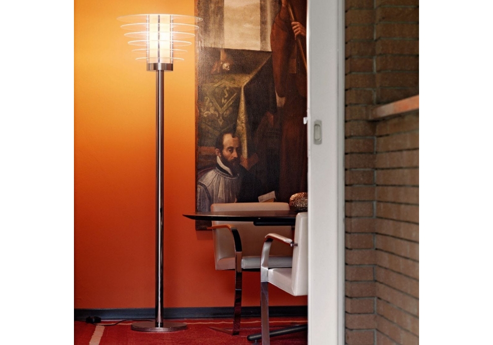 0024 conçu par Gio Ponti pour Fontana Arte est un lampadaire à lumière diffuse et dimmable avec interrupteur coulissant. Structure en métal chromé. Disques en verre trempé transparent. Diffuseur central cylindrique en verre sablé résistant à la chaleur. Cordon d'alimentation, gradateur et prise noirs.