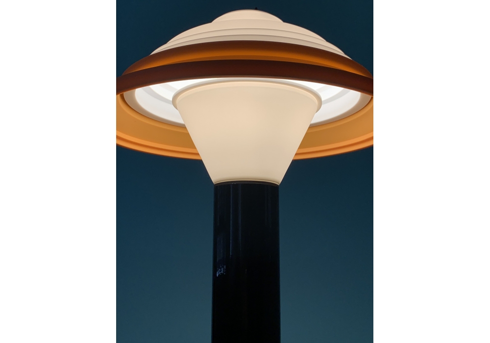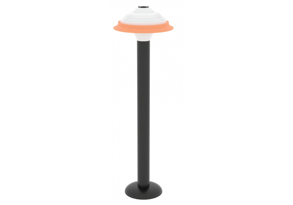 FL4 produit par Sowden est un lampadaire LED avec base en aluminium moulé sous pression, poteau en aluminium extrudé noir et abat-jour en silicone finition blanc et orange.