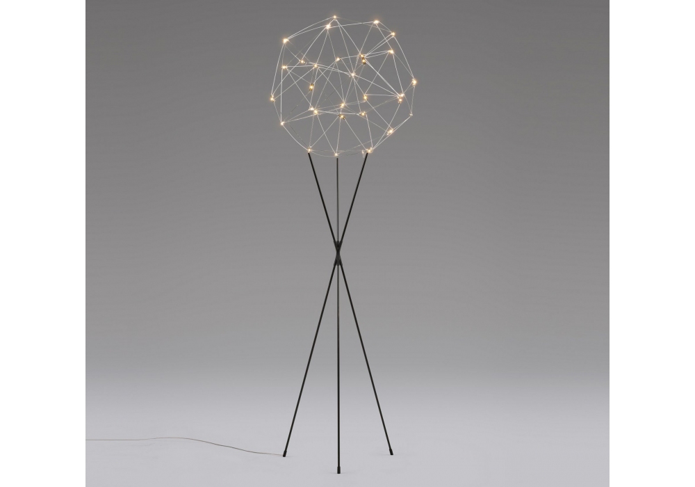 Cosmos conçu par Jan Pauwels pour Quasar est un lampadaire avec trois pieds croisés en métal tubulaire peint en noir. Le corps de lampe sphérique circulaire et déstructuré est composé d'une série de tiges de métal peint ancrées les unes aux autres. Les sources lumineuses fixées à la structure porteuse sont de type LED. Cosmos est disponible en différentes finitions.
