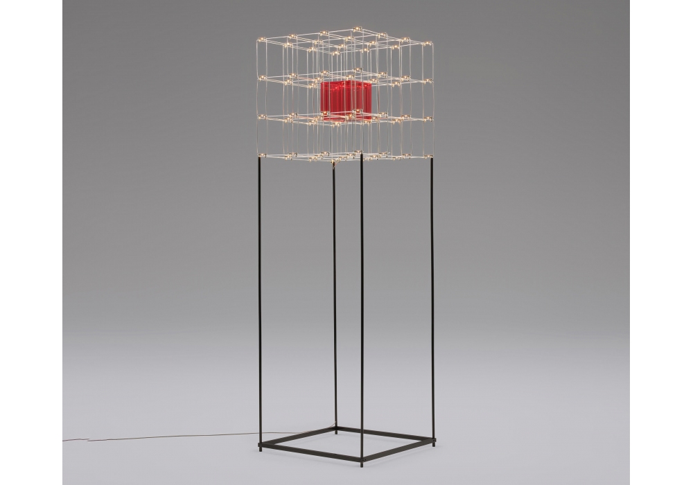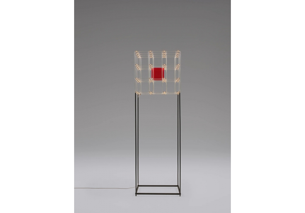Cosmos Saquare conçue par Jan Pauwels pour Quasar est un lampadaire à structure quadrangulaire en métal tubulaire peint en noir. Le corps de la lampe de forme quadrangulaire est structuré par une série de tiges de métal peint ancrées les unes aux autres. Les sources lumineuses fixées à la structure porteuse sont de type LED. Cosmos Saquare est disponible en différentes finitions et sur demande avec un noyau central de couleur rouge, bleu ou fumé.