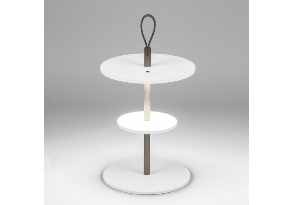 Servoluce conçu par Park Associati pour Firmamento Milano est un lampadaire / table d'appoint lumineuse à lumière indirecte réalisé avec une structure en aluminium peint, une tige en laiton et une poignée en cuir.