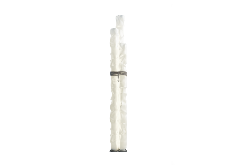 Baggy conçu par Paola Navone pour Contardi est un lampadaire avec une base circulaire grise et un corps de lampe cylindrique irrégulier en polycarbonate bi-satiné et corde en tissu blanc et gris. La source lumineuse est de type Strip LED avec un système de gradation à pédale sur le câble d'alimentation.