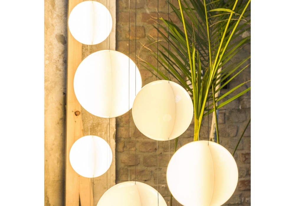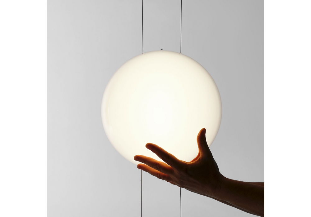 Orbit conçue par Marco Cattaneo pour Mogg est un lampadaire-plafonnier dimmable avec diffuseur sphérique disponible en diamètres 20 et 28 cm qui coulisse sur des câbles en acier parallèles. Nécessite une fixation au plafond à l'endroit souhaité. Longueur du câble 400 cm. Il est possible de positionner jusqu'à 3 diffuseurs sphériques pour chaque structure. Base au sol et support au plafond peints en noir RAL 9017.