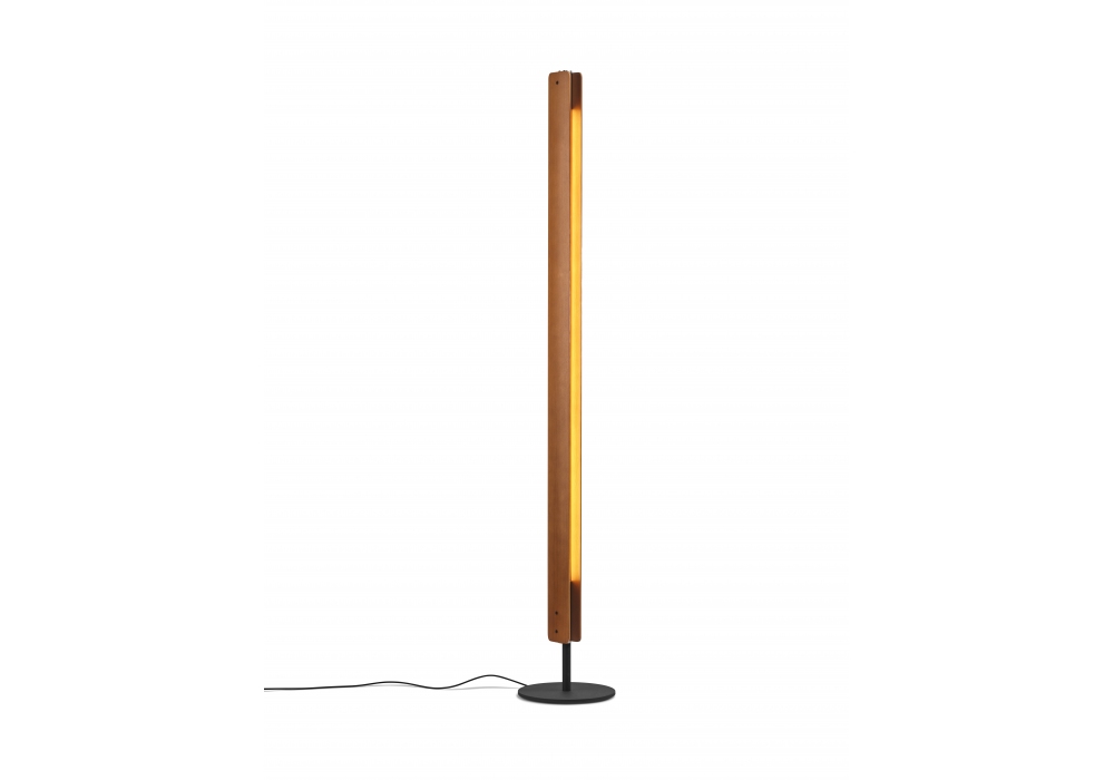 Seki-Han conçu par Tobia Scarpa pour Flos est un lampadaire réalisé avec une structure en frêne traité thermiquement et usiné CNC, des embouts et une rosace en aluminium poli et zaponisé. Il est réglable grâce à un variateur à pédale, positionné sur le câble du produit.