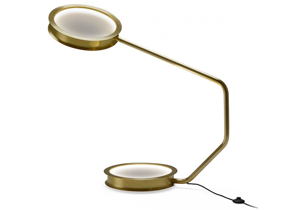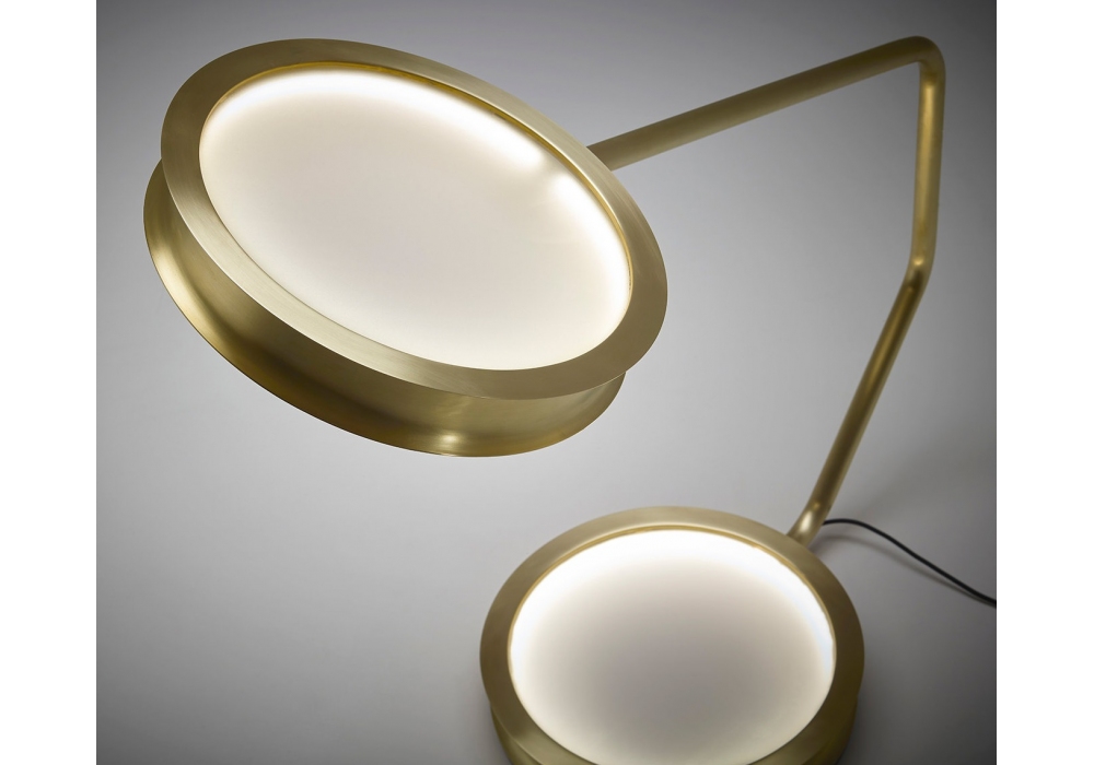 After Glow by Ceccotti Collezioni is a floor lamp with lighting body in burnished or brushed brass and tempered glass with tubular stem and 4 little brass feet, with led light.