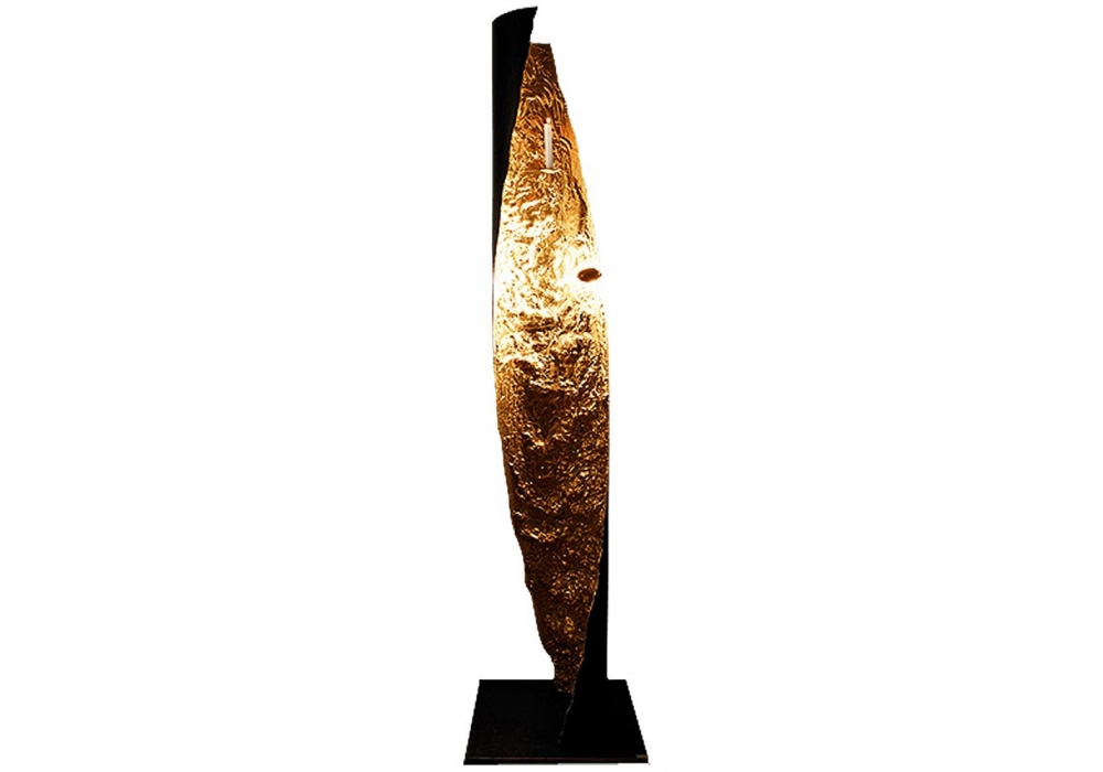 Stchu-Moon 09 conçu par Enzo Catellani pour Catellani & Smith est un lampadaire à LED, avec structure en fer brut ciré avec surface interne irrégulière recouverte de feuille disponible en différentes finitions. Les cuillères porte-lampe sont en acier, avec un bougeoir amovible.