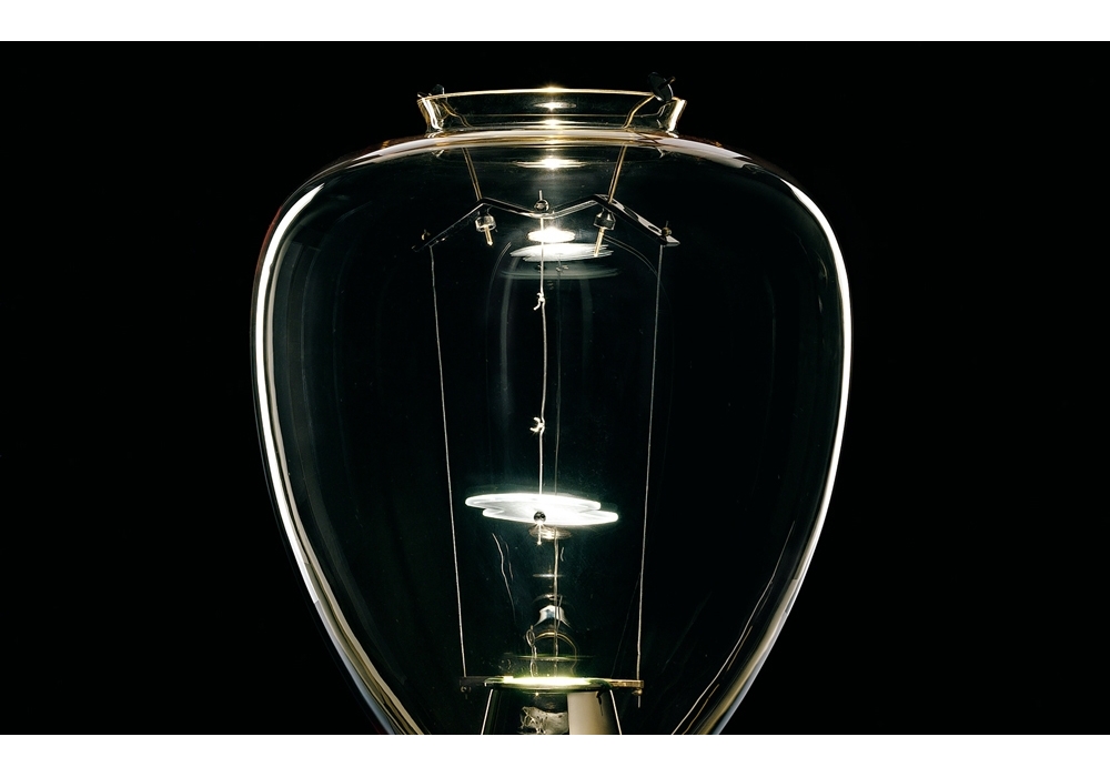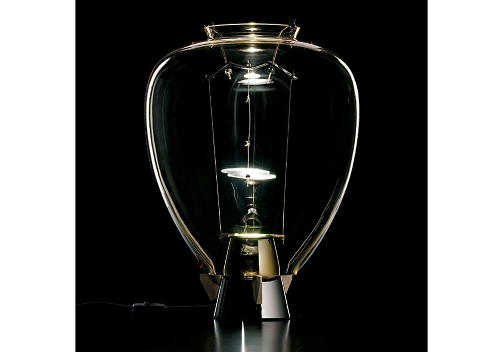 Veronese conçue par Umberto Riva pour Barovier & Toso est une lampe de table avec base et structure en métal chromé noir. Le diffuseur est en verre vénitien et abrite une source de lumière LED dimmable. Veronese est disponible en différentes finitions.