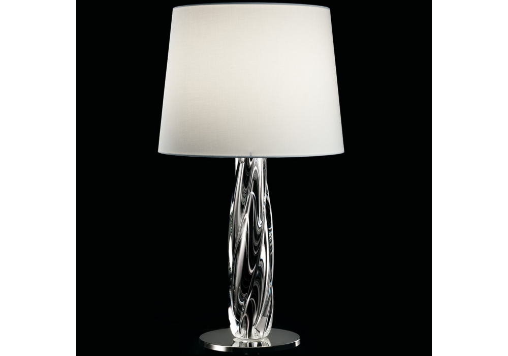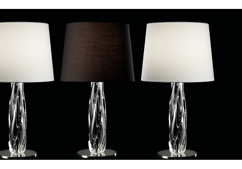 Twins conçue et produite par Barovier & Toso est une lampe de table avec une base circulaire en métal et un corps en verre vénitien transparent. L'abat-jour est en tissu et abrite une source lumineuse LED ou halogène dimmable. Twins est disponible en différentes finitions.