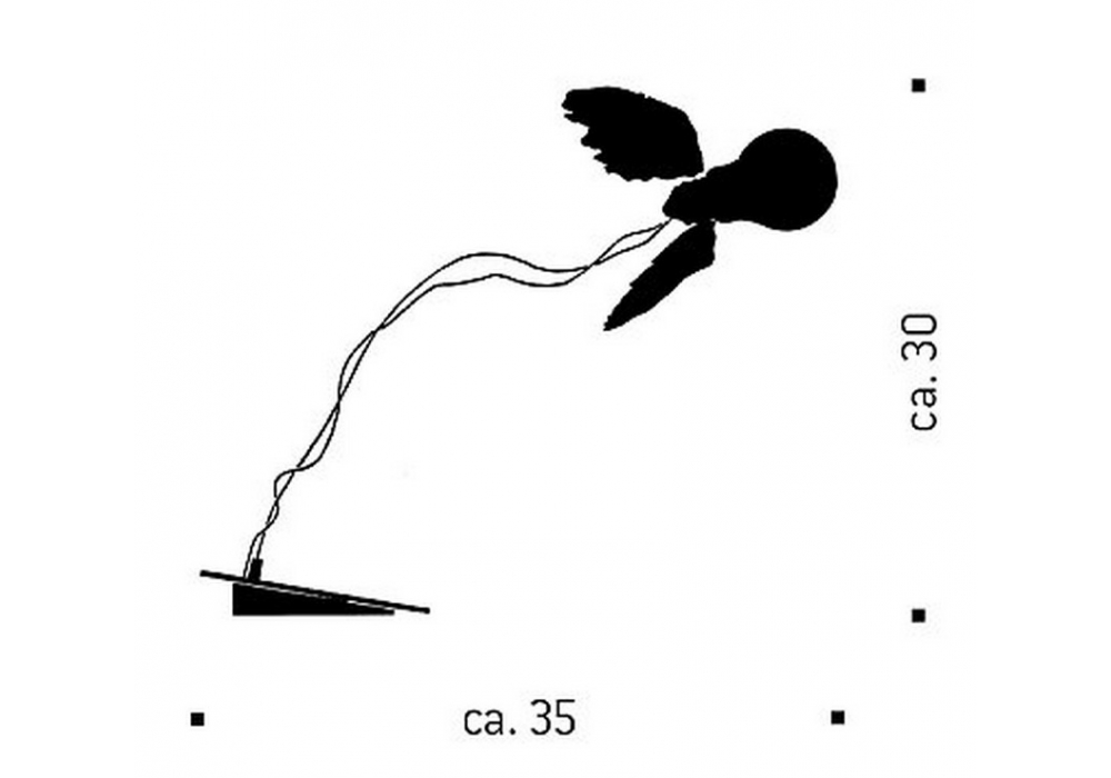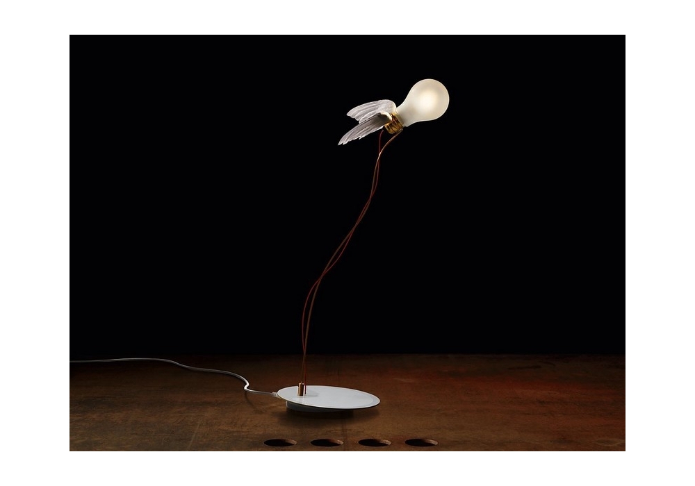 Lucellino LED conçue et produite par Ingo Maurer est une lampe de table avec structure en verre, laiton et plastique, avec application d'ailes faites à la main avec des plumes d'oie. La source lumineuse est Ambient, produite exclusivement pour Ingo Maurer.