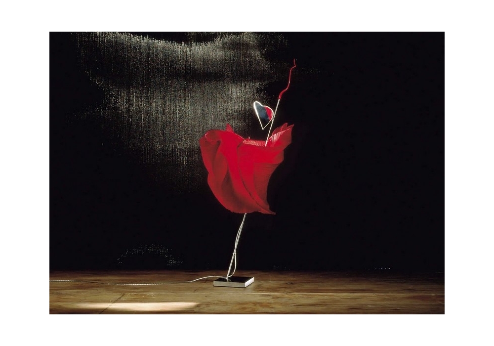 Kokoro conçue par Dagmar Mombach pour Ingo Maurer est une lampe de table à LED, avec structure en métal et acier inoxydable, diffuseur en papier rouge et détails en verre et matière synthétique. Miroir réglable.