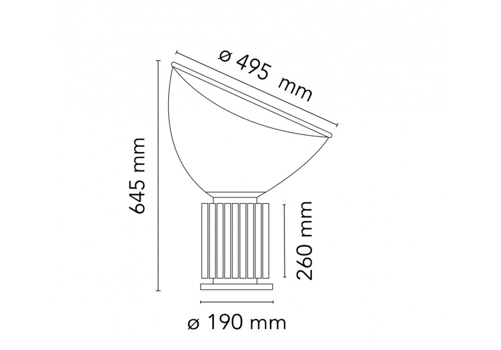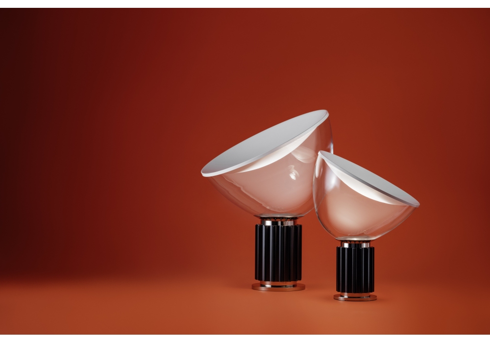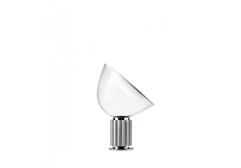 Taccia conçue par Achille & Pier Giacomo Castiglioni pour Flos est une lampe de table à lumière indirecte et réfléchie. Réflecteur en aluminium peint, blanc brillant à l'extérieur et blanc mat à l'intérieur. Diffuseur orientable en PMMA transparent. Corps en aluminium extrudé peint. Base en métal nickelé. Câble électrique avec variateur d'intensité garantissant les fonctions ON/OFF et le réglage du flux lumineux de 10 à 100 %. Alimentation sur prise avec fiches interchangeables. Source lumineuse LED incluse.