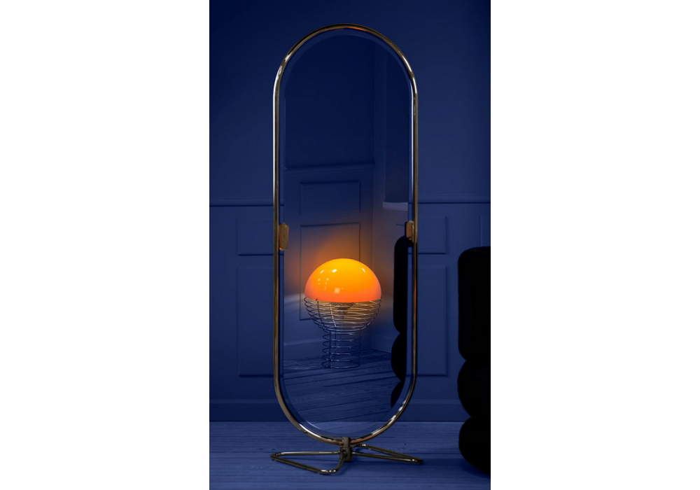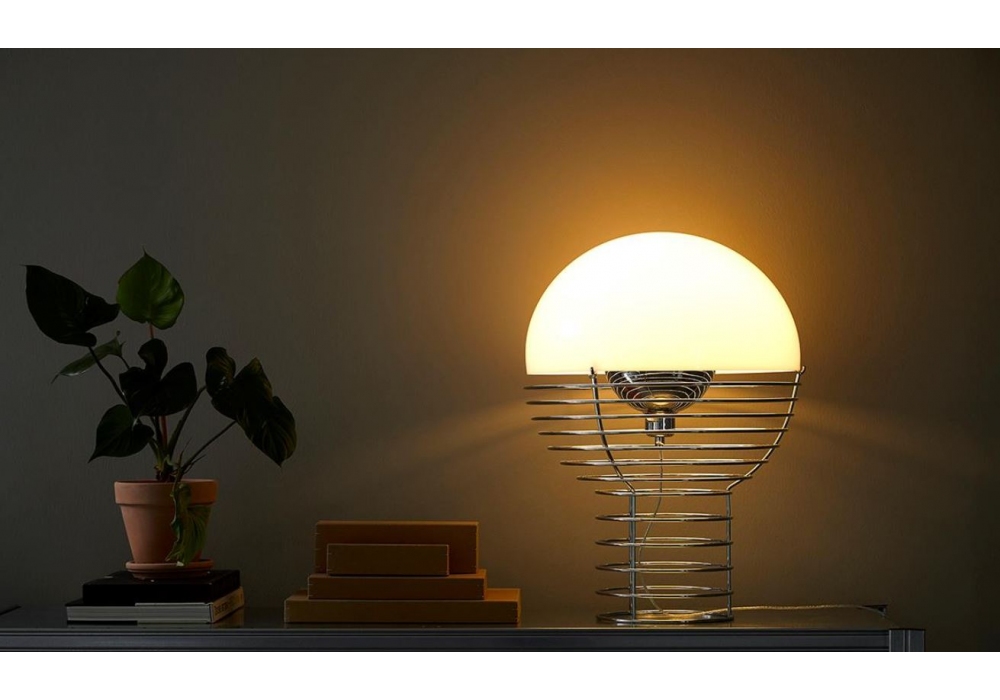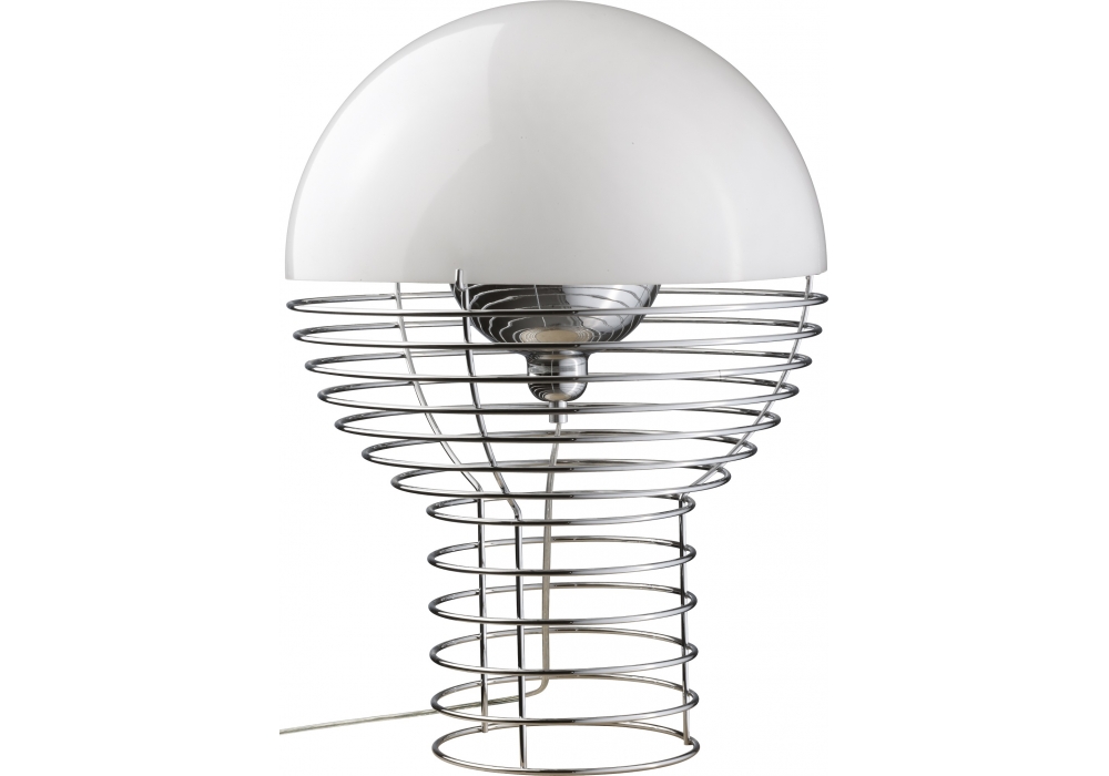 Wire conçue par Verner Panton pour Verpan est une lampe de table avec une structure cylindrique en fil métallique qui s'élargit en un hémisphère au sommet. Abat-jour hémisphérique en plastique blanc ou orange. Il y a un interrupteur marche/arrêt transparent sur le câble d'alimentation.