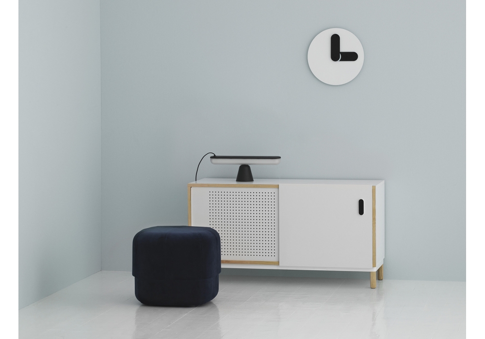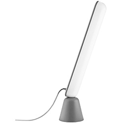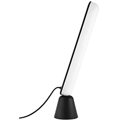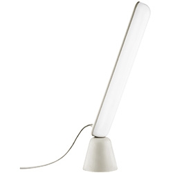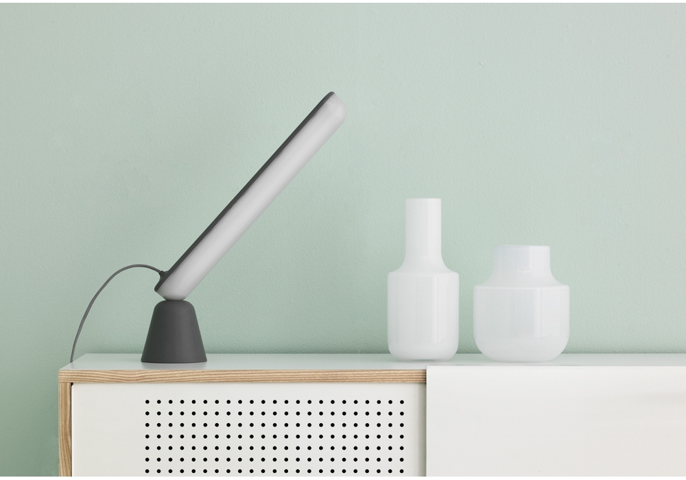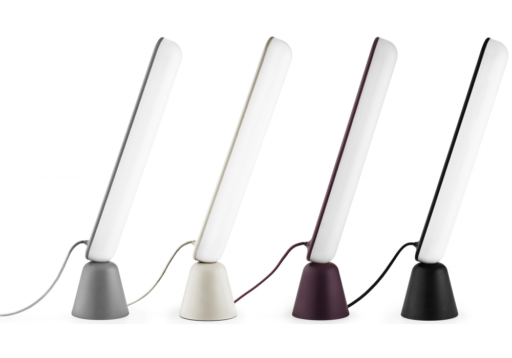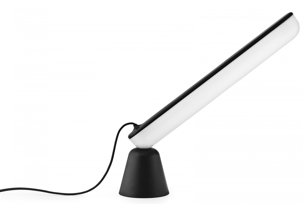 Acrobat conçue par Marc Venot pour Normann Copenhagen est une lampe de table avec base en plastique et diffuseur en acrylique. Acrobat est composé de deux parties, une base en forme de cône et une source lumineuse LED allongée, reliées uniquement par des électroaimants, qui permettent des méthodes de positionnement à multiples facettes.