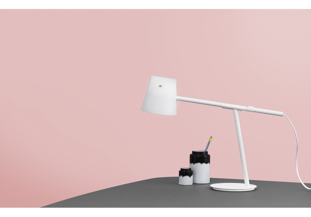 Momento conçue par Daniel Debiasi & Frederico Sandris pour Normann Copenhagen est une lampe de table à base circulaire en métal enduit de poudre. Structuré par un bras métallique coulissant, pour avoir la bonne position en longueur ou en profondeur, et un abat-jour en plastique rotatif, pour diriger la lumière vers le point souhaité. La source lumineuse est à LED (incluse), alimentée par un câble recouvert de fibre textile de la même couleur que la lampe. Momento est disponible en version EU (Europe) ou US (U.S.A), et en quatre couleurs différentes ; noir, blanc, gris ou vert pétrole.