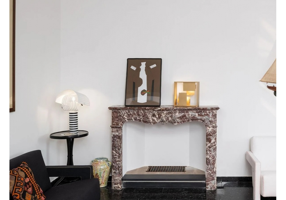 Shogun conçue par Mario Botta pour Artemide est une lampe de table avec base cylindrique et tige verticale en métal strié peint en noir et blanc. Les diffuseurs sont orientables en tôle courbée et perforée et abritent une source lumineuse LED.