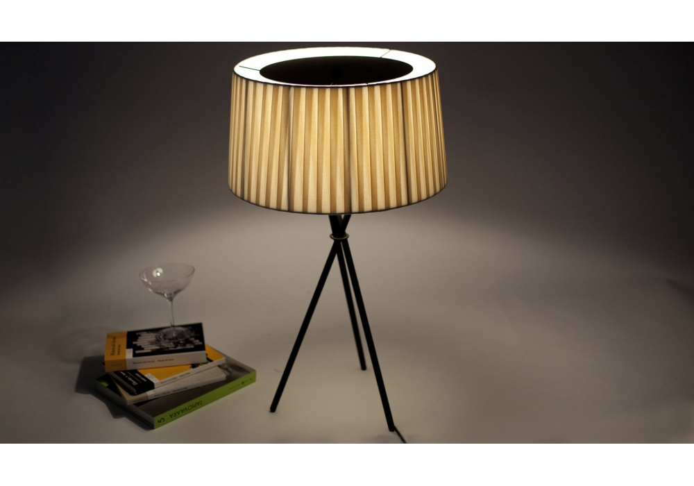 Tripode conçue par Santa&Cole Team est un belle lampe de table avec structure en métal et abat-jour disponible en différentes finitions. Il s'agit ici d'un faisceau de trois tubes noirs unis, comme un jeu de baguettes chinoises, portant un vaste abat-jour enrubanné. Allumée, la lampe fournit beaucoup de lumière chaleureuse, et éteinte elle constitue une sculpture volumétrique dignifiant l’espace. Également disponible en 2 dimensions.