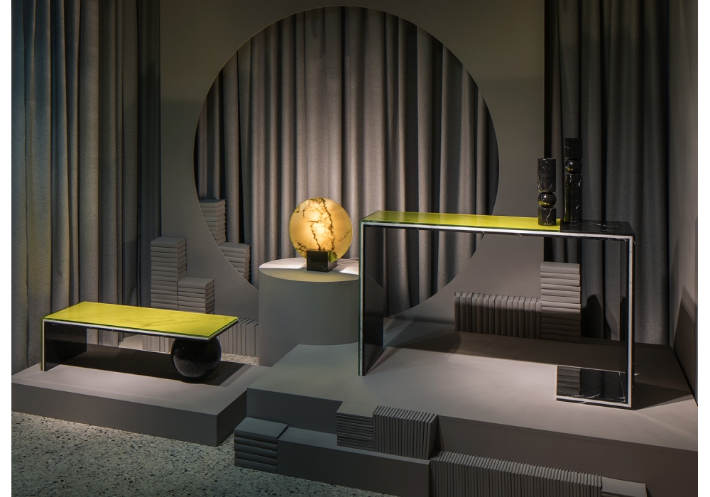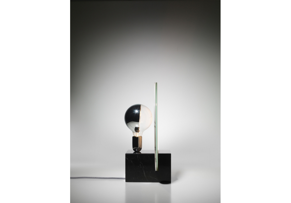 Acid Marble conçue par Lee Broom est une lampe de table avec une couche de marbre de carrare blanc et un verre teinté jaune, pris en sandwich pour former un diffuseur circulaire éclairé. Dans une base de marbre en marbre noir solide, les veines du marbre de carrare sont visibles à travers le verre, ce qui permet au marbre d'apparaître en jaune, ce qui donne à ce matériau très classique une torsion ludique.