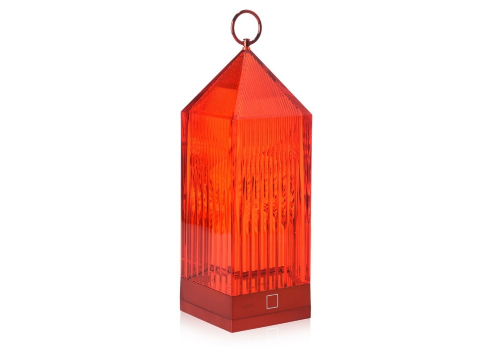 Lantern conçue par Fabio Novembre pour Kartell est une lampe de table à LED portable originale, une "lanterne rechargeable" transparente, moulée par injection, qui se recharge en la posant sur une base conductrice. La lumière est projetée grâce à un effet de design graphique.