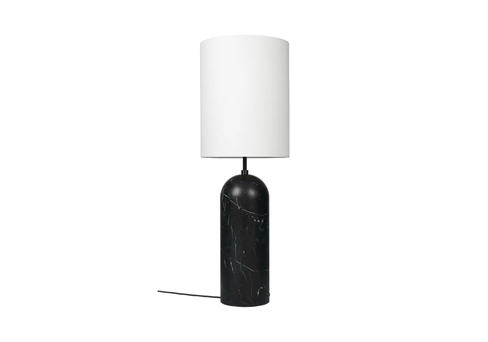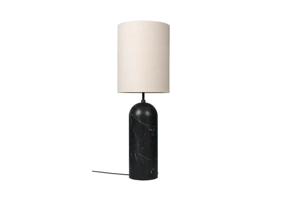 Gravity conçue par Space Copenhagen pour Gubi est une lampe de table avec base en marbre noir, marbre gris ou acier et abat-jour en canvas ou blanc. Disponible en deux dimensions. Dimmer sur la base. Ampoule non incluse.