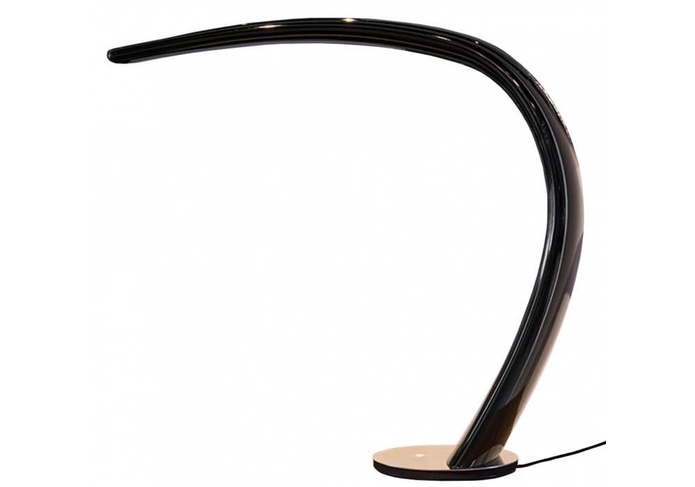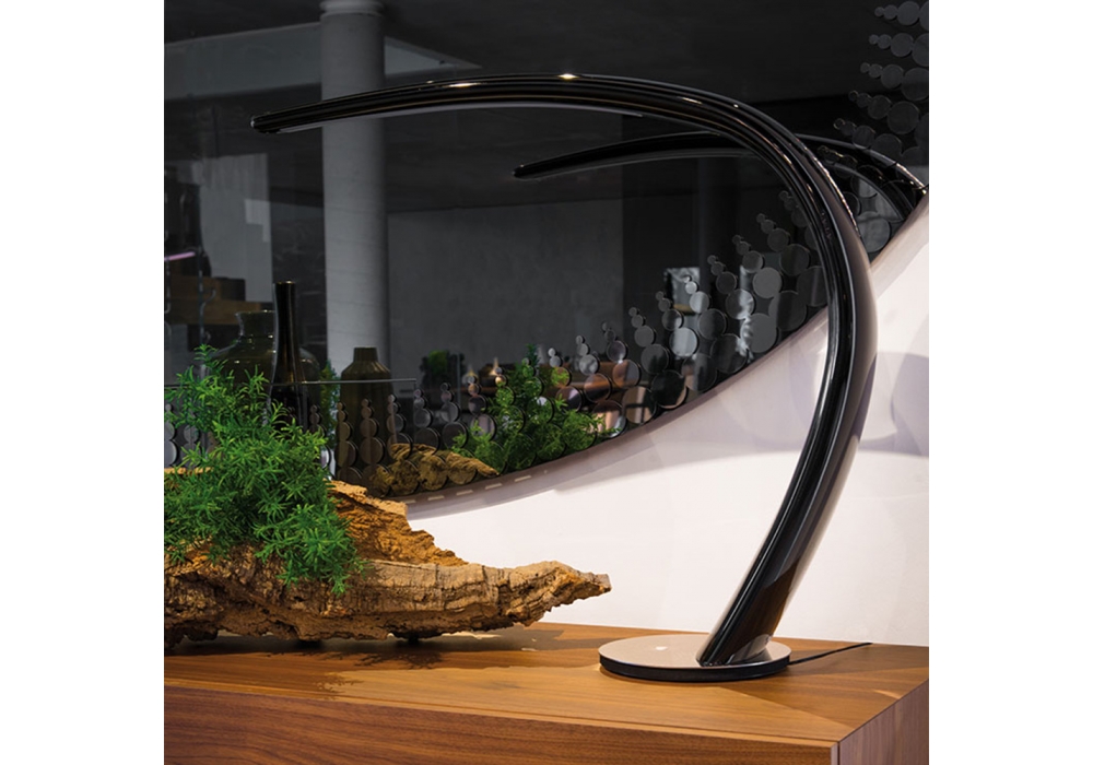 Mamba conçue par Piero De Longhi pour Cattelan Italia est une lampe de table en polyuréthane rigide laqué titan ou noir brillant avec base en acier inox brillant ou laqué brushed bronze avec base en chrome noir. Avec interrupteur. Ampoule LED incluse.