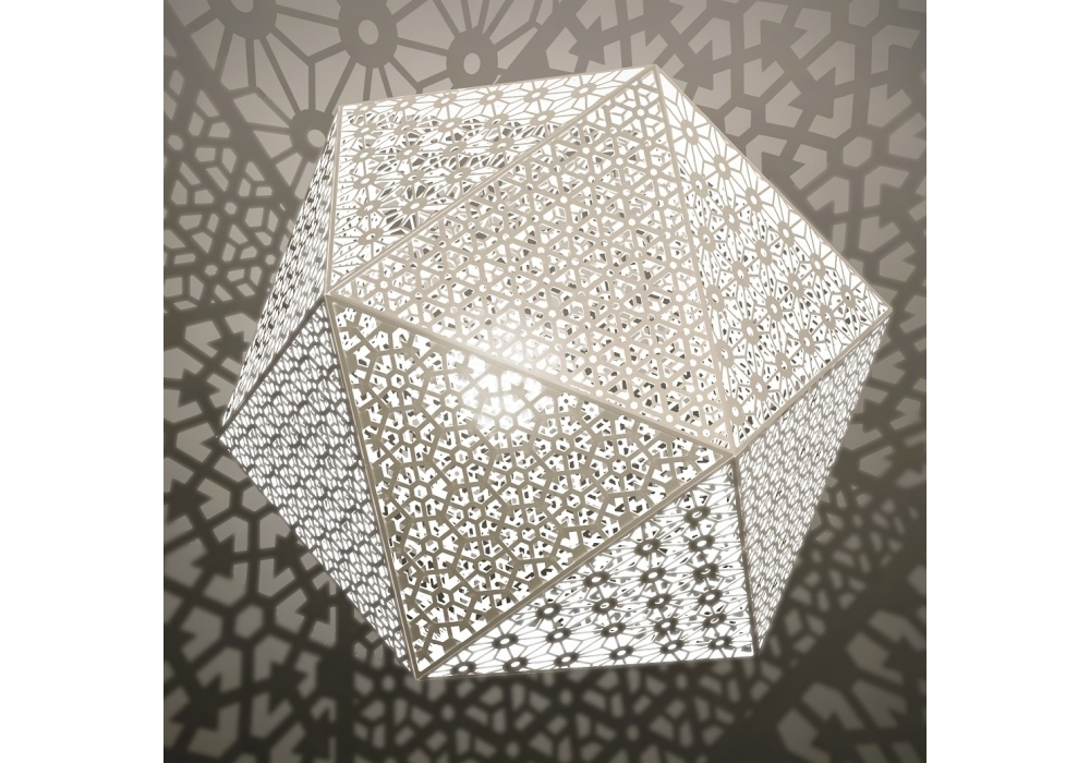 Rontonton conçu par Edward van Vliet pour Quasar est une lampe de table ou de sol, de forme polyédrique avec une structure en métal peint dans les finitions laiton, noir ou blanc. La source lumineuse est halogène ou LED (non incluse), avec câble d'alimentation transparent pour les versions 15 et 22 et noir pour les versions 50 et 75. L'interrupteur marche-arrêt est assorti aux finitions de la lampe dans les couleurs laiton, noir ou blanc. Rontonton est disponible en quatre tailles différentes.