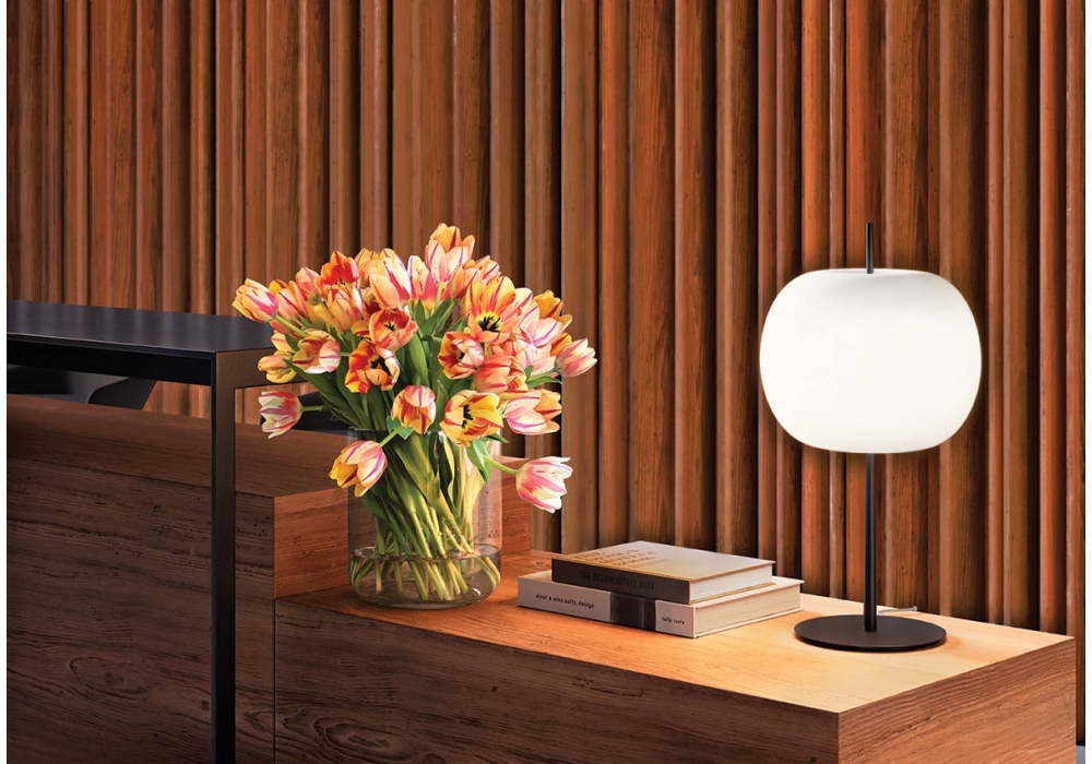 Kushi XL conçue par Alberto Saggia & Valerio Sommella pour Kundalini est une lampe de table avec diffuseur en verre opalin soufflé double couche et corps en métal verni disponible en finitions, noir, cuivre et laiton.