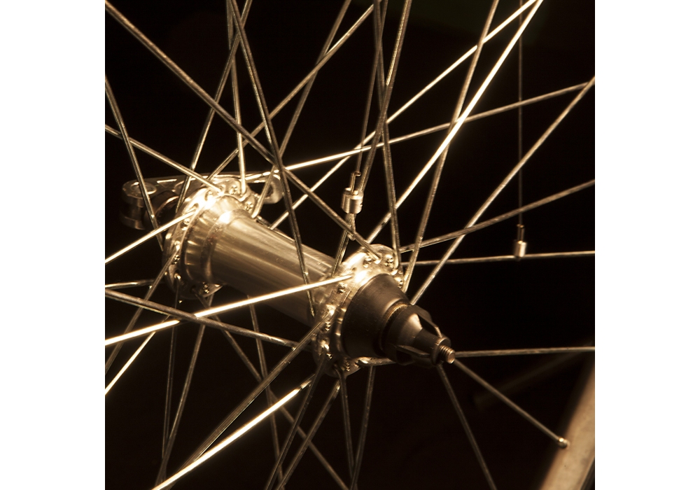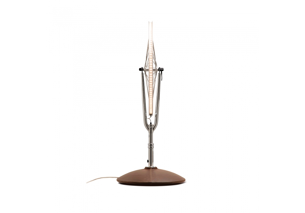 Gino conçu par Fabio Antinori pour Cyclampa est une lampe de table en aluminium. La lampe est composée d’une roue en aluminium moulé sous pression. Ledstrip haute capacité, équipé d'une puce de contrôle thermique intégrée. Corps en acier chromé (composant d'origine de la fourche), commutateur Infinity, capuchon en aluminium recouvert de cuir synthétique cousu à la main.