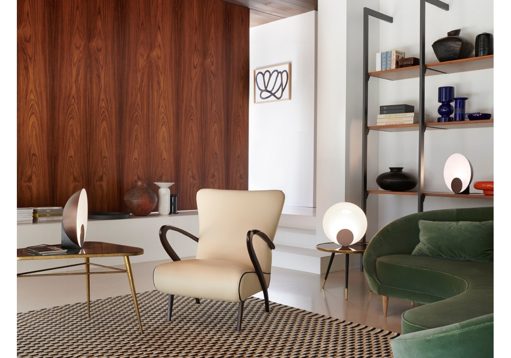 Siro conçue par Marta Perla pour Oluce est une lampe de table circulaire avec base en métal peint en noir. Le diffuseur est en aluminium émaillé et masque une source lumineuse LED dimmable. Siro est disponible en différentes finitions et tailles.