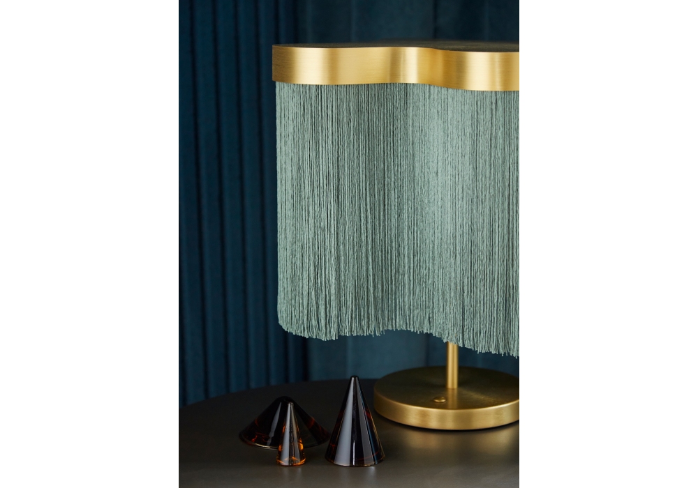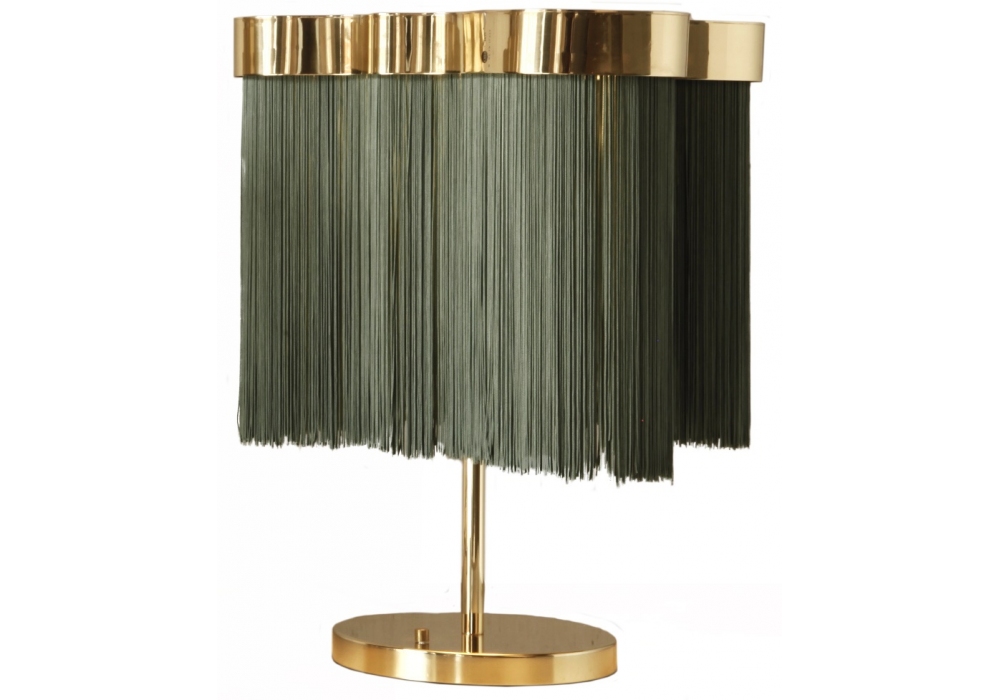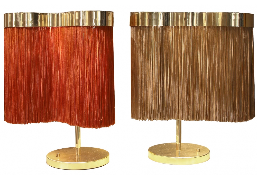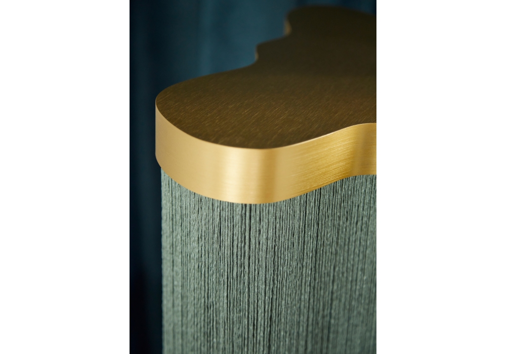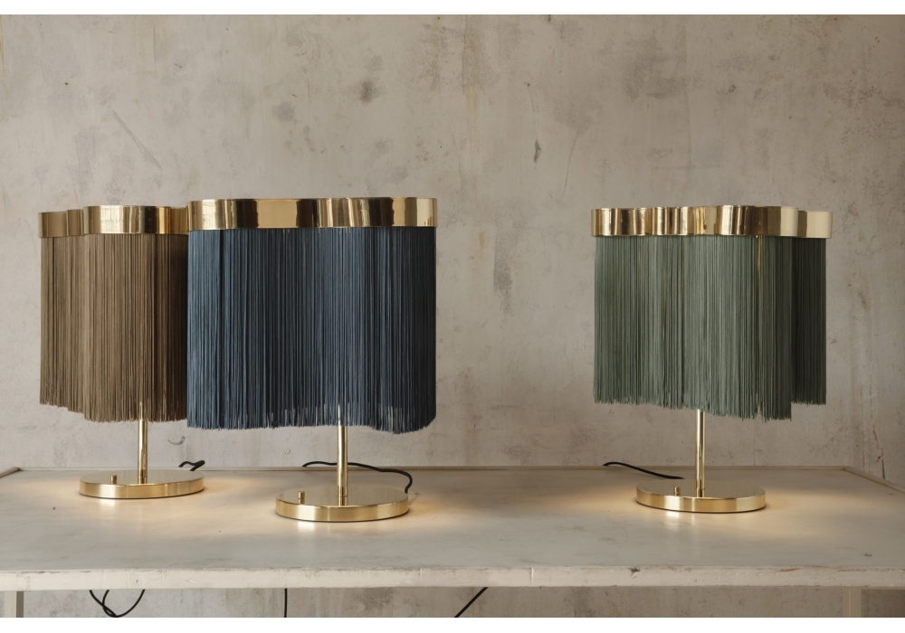 Arcipelago conçue par Servomuto pour Contardi est une lampe de table avec base circulaire et structure verticale en laiton poli. L'abat-jour est en tissu frangé et protège une source de lumière LED. Arcipelago est disponible en différentes finitions de tissu.