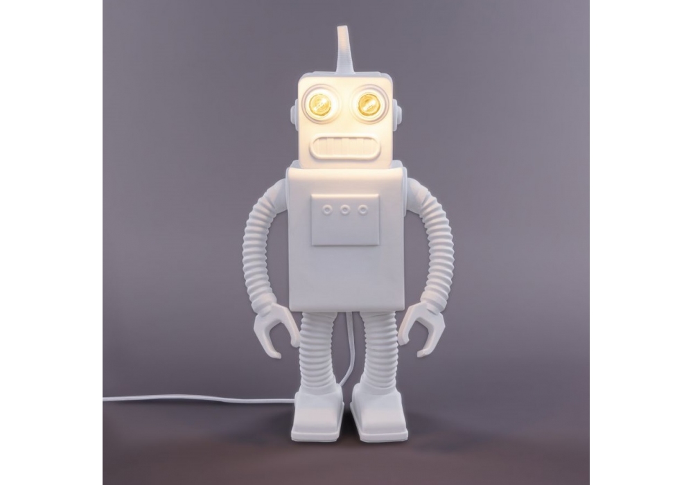 Robot conçue par Marcantonio pour Seletti est une lampe de table en porcelaine blanche. Les sources lumineuses utilisées sont de type LED à 2200 K°.