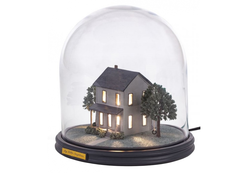 My Little Neighbor conçue par Marcantonio pour Seletti est une lampe de table avec une base circulaire en résine avec la représentation d'un petit diorama. La cloche de protection est en verre avec une source lumineuse LED avec un système dimmable alimenté par un câble USB.