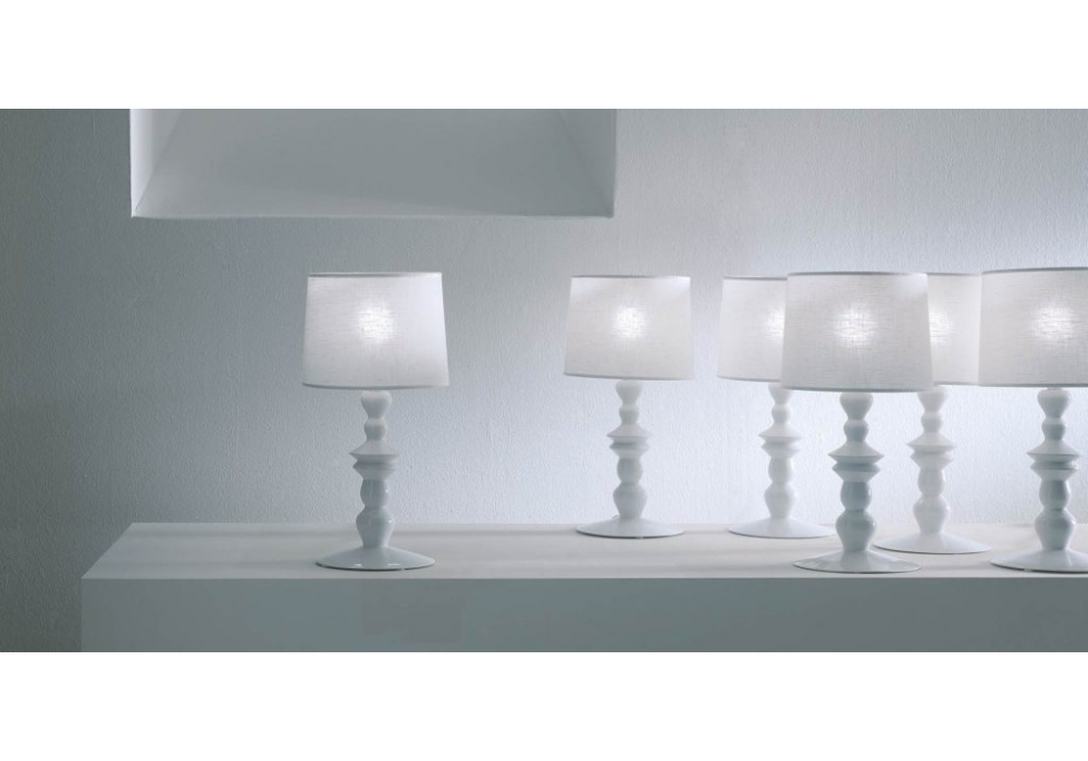 Alibababy conçue par Matteo Ugolini pour Karman est une lampe de table réalisée en céramique blanc brillant et abat-jour en lin blanc. Ampoule non incluse.