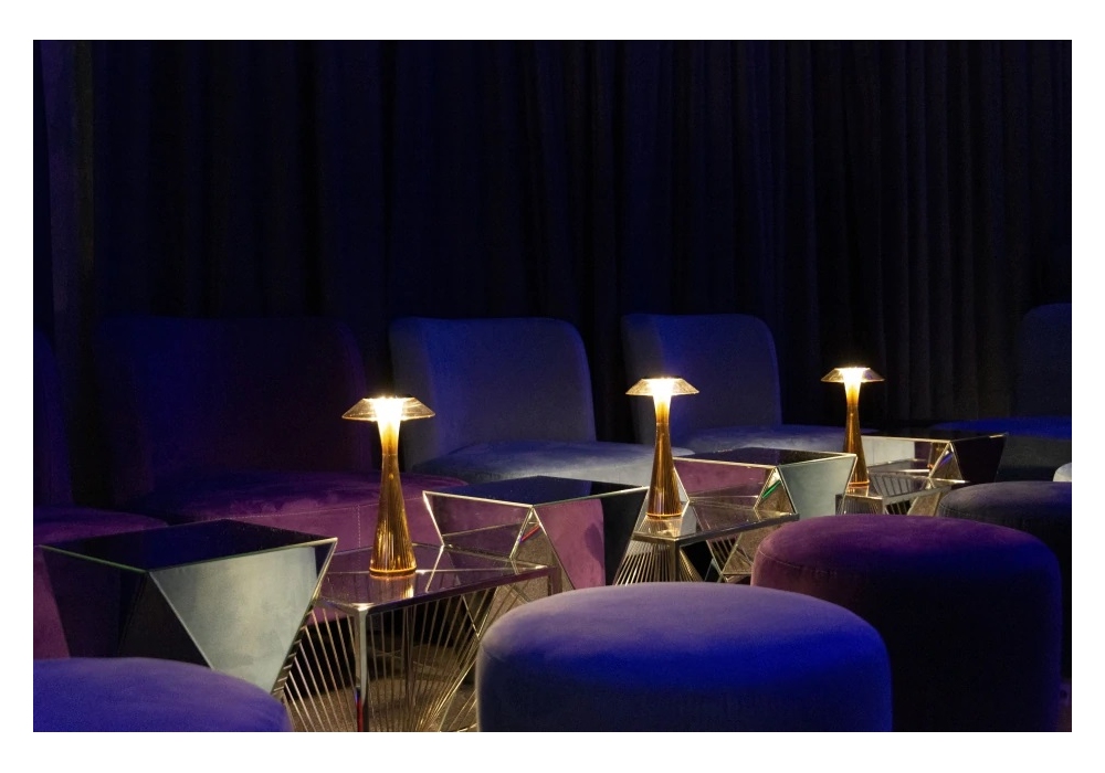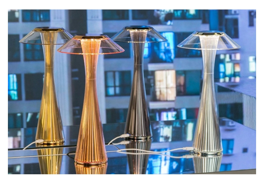 Space conçu par Adam Tihany pour Kartell est une lampe de table, diffuseur en PMMA transparent et corps de lampe en ABS métallisé, disponible en quatre finitions.