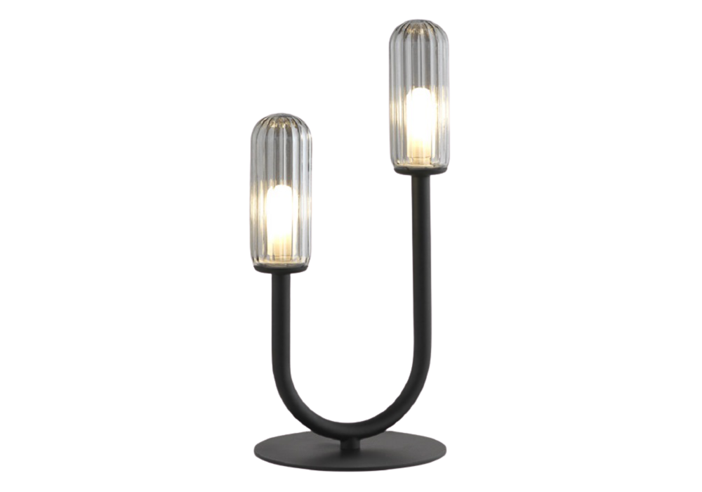 Unco conçue par Pepe Fornas pour Aromas del Campo est une lampe de table avec structure en métal disponible en deux variantes (laiton mat ou noir mat) et diffuseur en verre fumé gris.