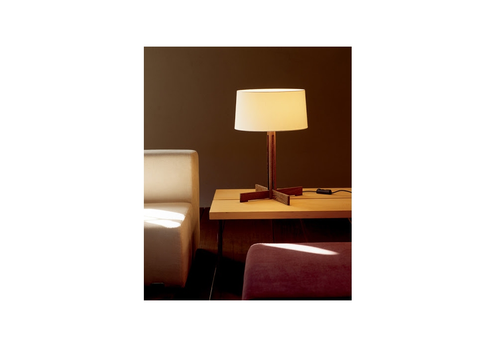 FAD conçue par Miguel Mila pour Santa&Cole est une lampe de table avec une structure en chêne naturel et un diffuseur en lin blanc.