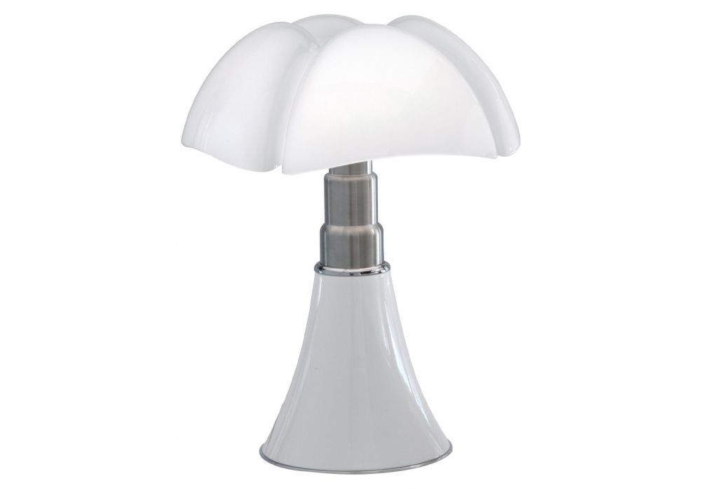 Minipipistrello Cordless conçue par Gae Aulenti pour Martinelli Luce est une lampe de table portable et rechargeable avec capteur tactile. Le bras télescopique central est en acier inoxydable avec un support circulaire en métal peint. Le diffuseur est en méthacrylate blanc opale et abrite une source lumineuse LED intégrée dimmable. Minipipistrello Cordless est disponible en différentes finitions.
