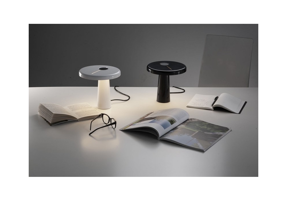 Hoop conçue par Adolini & Simonini pour Martinelli Luce est une lampe de table avec base cylindrique en résine en différentes finitions. Le diffuseur est circulaire en méthacrylate opale satiné et abrite une source lumineuse LED intégrée alimentée par un câble en plastique.