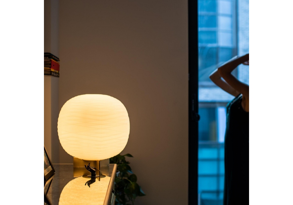 Gem conçue par Ludovica & Roberto Palomba pour Foscarini est une lampe de table structurée par une base en métal doré. Le diffuseur est sphérique en verre soufflé dépoli à l'acide avec une surface en relief et abrite une source lumineuse LED ou halogène dimmable avec douille E27.